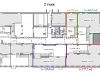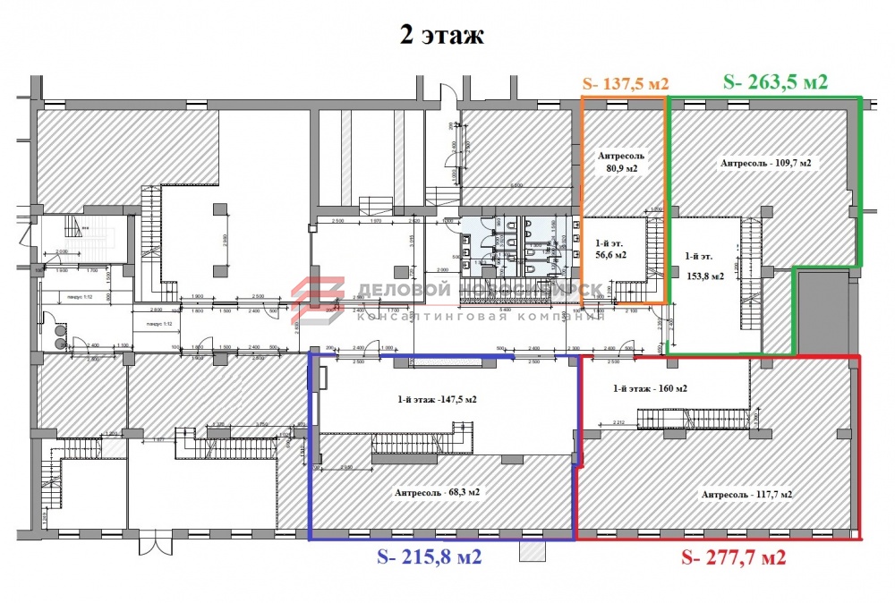 Остались 4 офисных блока: 137,5 кв.м (1 этаж 56,6 кв.м и антресоль 80,9 кв.м); 215,8 кв.м (1 этаж 147,45 кв.м и антресоль 68,3 кв.м); 263,5 кв.м (1 этаж 153,8 кв.м и антресоль 109,7 кв.м); 277,7 кв.м (1 этаж 160 кв.м и антресоль117,7 кв.м). Все офисные блоки можно объединять между собой и соответственно увеличивать площадь до 894,5 кв.м.
