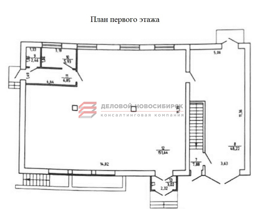 Первый этаж площадью 226 кв.м, торговый зал площадью 151,64 кв.м, гараж-склад 48,22 кв.м, вспомогательные помещения, с/узел. Выполнен ремонт: в торговой части на полу керамогранит, потолок армстронг, высота потолка 3,3 м. Помещение оборудовано системами пожарной и охранной сигнализации. Использовалось под продуктовый супермаркет.