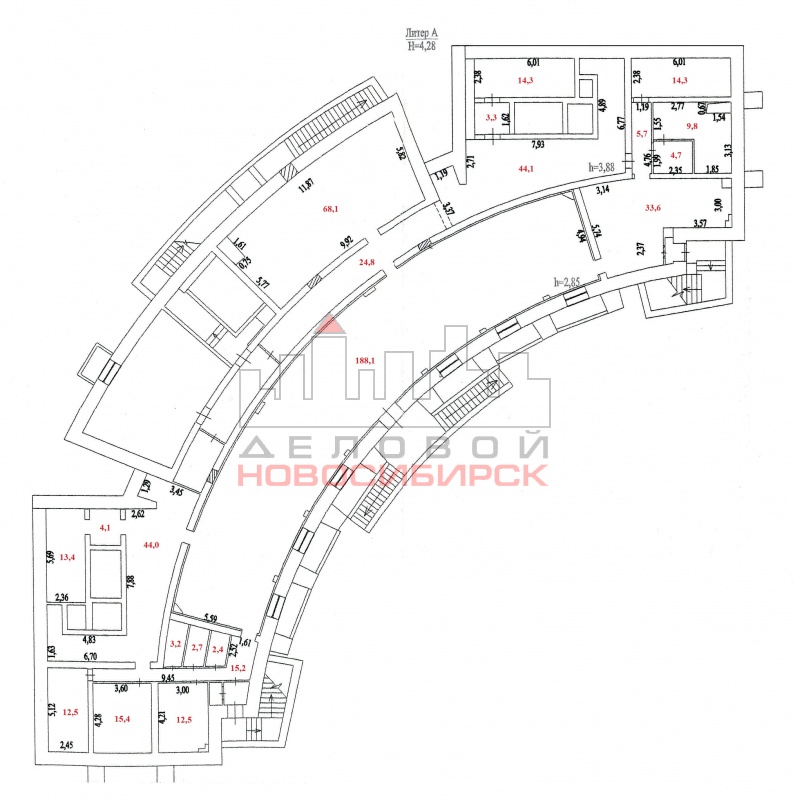 Цокольный этаж административной части жилого дома, общая площадь 543,1 кв.м, 4 отдельных входа, торговый зал - 188,1 кв.м и 33,6 кв.м, 4 складские комнаты от 16,36 кв.м до 69,7 кв.м, гардеробная, кабинеты - 13,46 кв.м, 16,36 кв.м, 4 с/узла, высота потолков 2,85 м, э/мощности 20 кВт, выполнен качественный ремонт, установлены система пожарно-охранной сигнализации, кондиционирования.