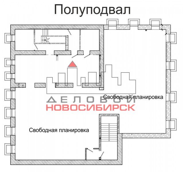 Цокольный этаж - имеет небольшие окна в приямках, высокий потолок 3,5 м, свободное пространство с возможностью планировки под административные и складские помещения.