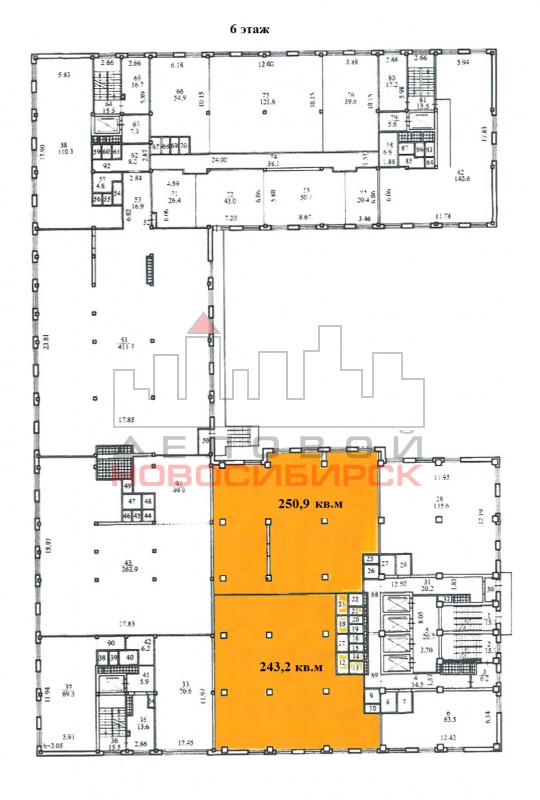 6 этаж общей площадью 494,1 кв.м, состоит из двух помещений - 243,2 кв.м и 250,9 кв.м, возможно объединить, свободной планировки, колонного типа, высота потолка 3,05 м, состояние ремонта - под самоотделку;