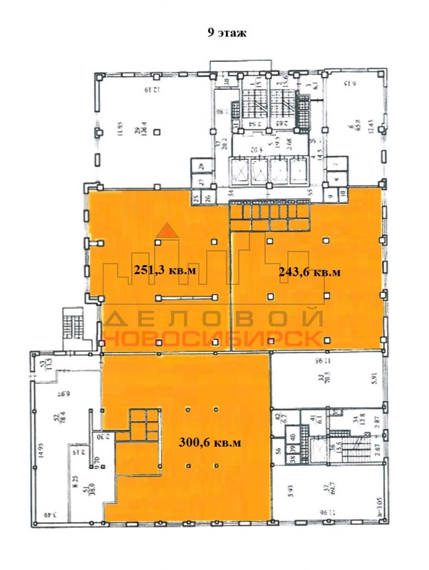 9 этаж площадью 795,5 кв.м, состоит из трех помещений - 300,6 кв.м, 251,3 кв.м, 243,6 кв.м, планировки свободные, колонного типа, в помещении 322,9 кв.м выделены подсобные помещения, все помещения возможно объединить, высота потолка 3,05 м, состояние ремонта - под самоотделку.