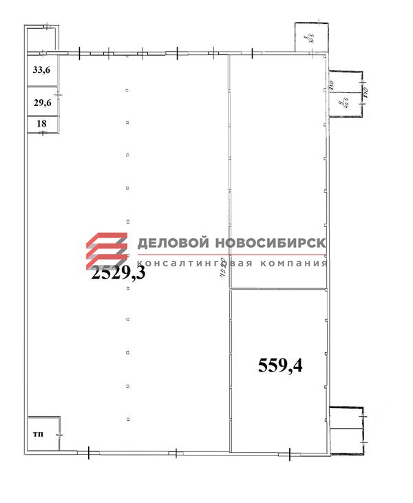 Цех №1: площадь общая 2529,3 кв.м, высота потолка 6 м (4,7 м до низа ферм), шаг колонн 6х18 м пол беспылевой, 7 ворот (двое для въезда еврофур в склад, двое для въезда Газели, одни ворота-доки для еврофуры и двое ворот-доков для Газели), подсобные помещения, с/узел;