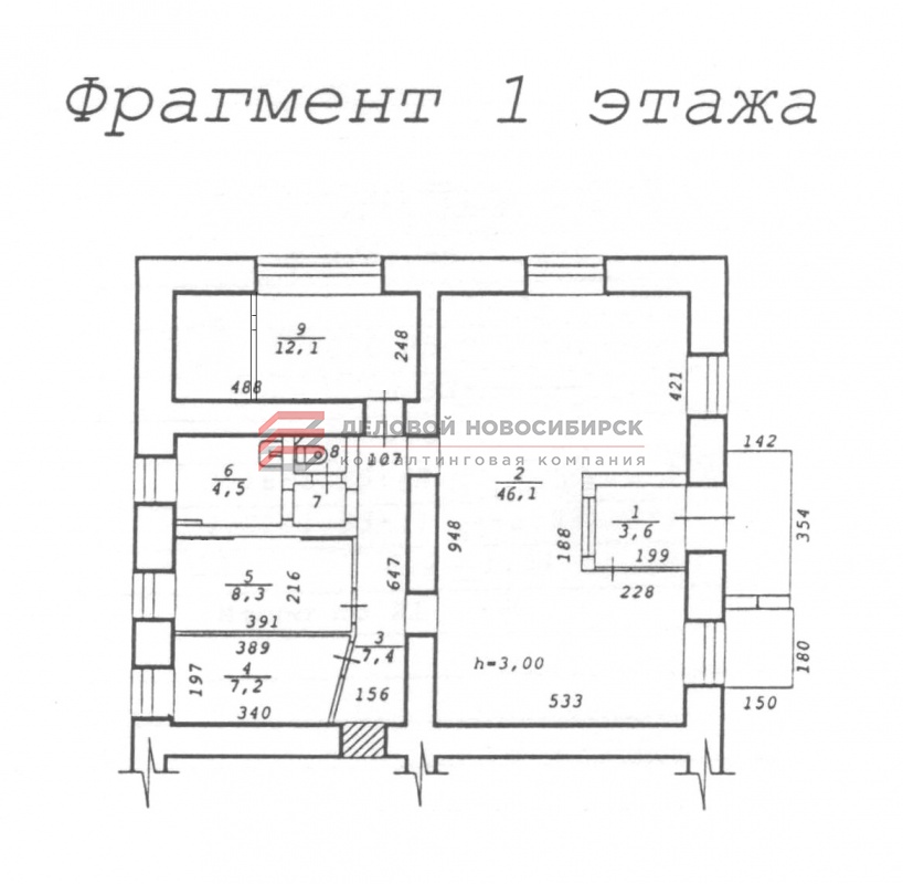 1 этаж жилого дома, общая площадь 94,1 кв.м, отдельный вход с торца дома, тамбур, зал 46,1 кв.м, 4 комнаты от 4,5 кв.м до 12,1 кв.м, с/узел, высота потолка 3 м, электрическая мощность 2,8 кВт.