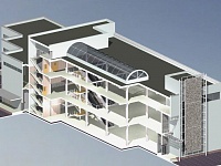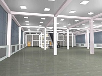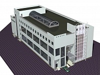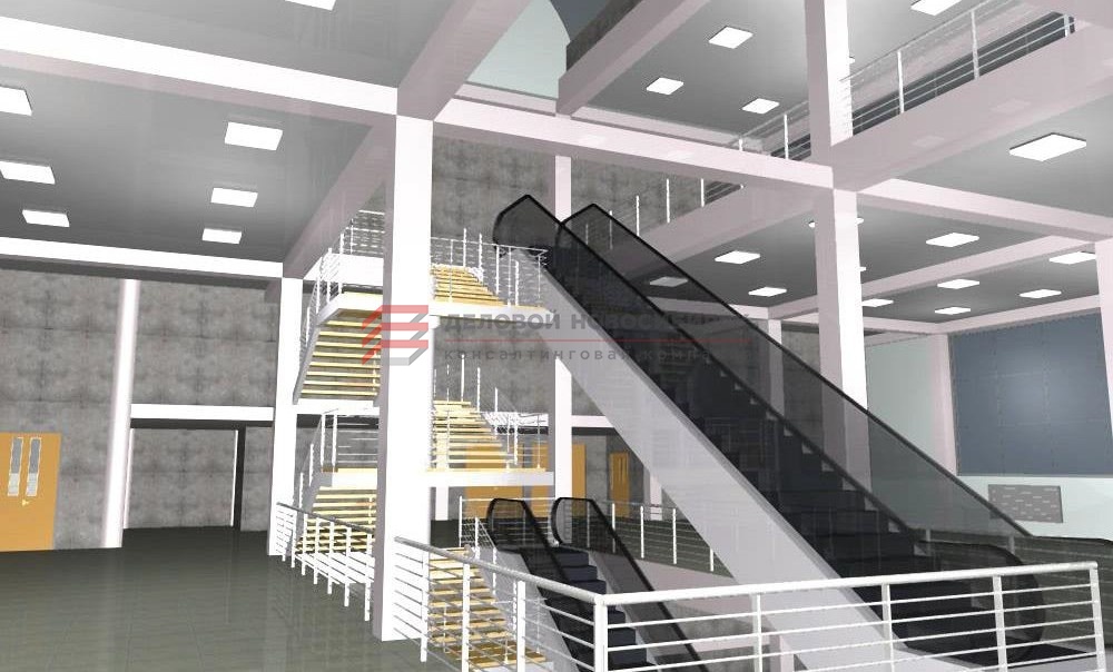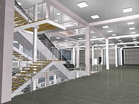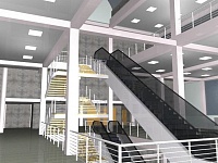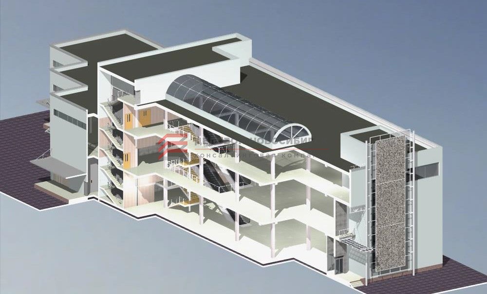 Высота первого и второго этажей составляет 6 м, высота третьего этажа 3 м. Сделаны шахты для двух грузовых лифтов и одного пассажирского, спроектированы эскалаторы для подъема и спуска на второй и третий этажи. К зданию подведены подъездные пути, предусмотрена парковочная зона на 77 авто.