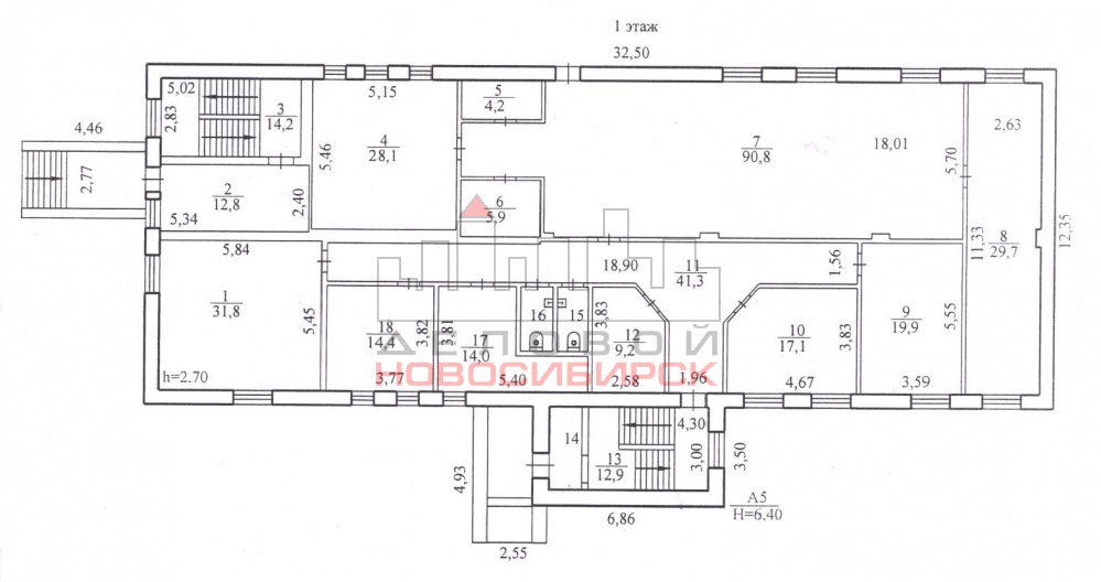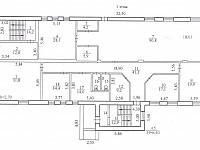 - 1 этаж площадью ориентировочно 350 кв.м, два отдельных входа и пожарный выход, высота потолка 2,70 м, окна по всему периметру, зал 90,8 кв.м, 8 кабинетов площадью от 9,2 кв.м до 31,8 кв.м, два с/узла. Возможно увеличение количества кабинетов за счет деления больших помещений;