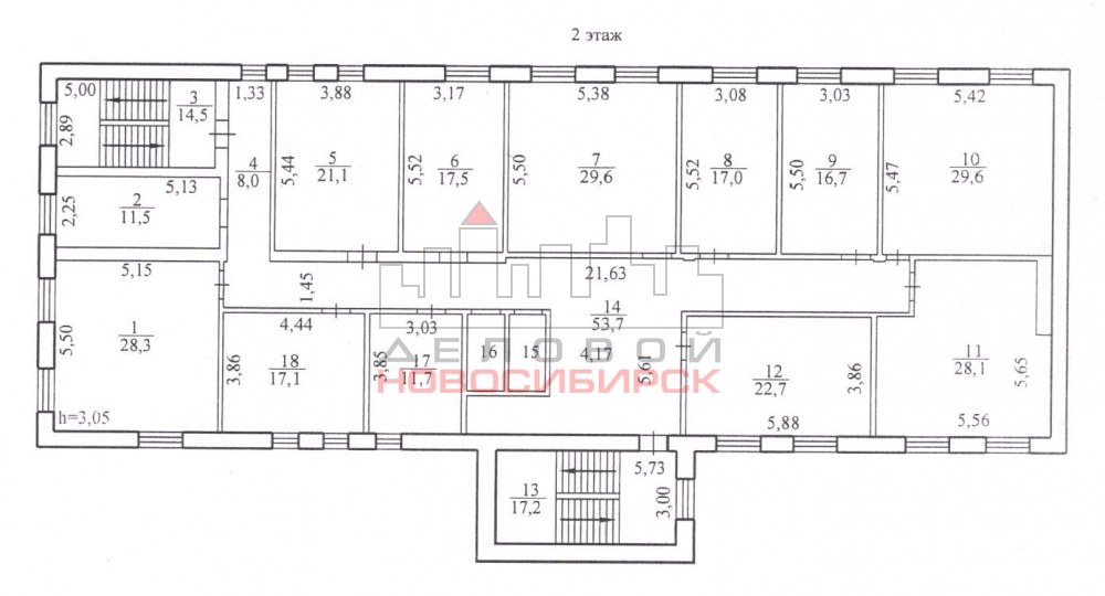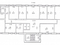 - 2 этаж площадью ориентировочно 350 кв.м, вход с 1 этажа и пожарный выход на улицу, высота потолка 3,05 м, окна по всему периметру, 11 кабинетов от 11,7 кв.м. до 29,6 кв.м, возможно увеличение количества кабинетов за счет деления больших помещений.