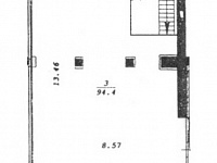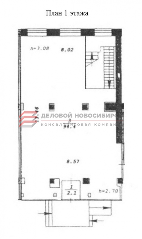 - 1 этаж 96,5 кв.м, отдельный вход, тамбур, торговый зал 94,4 кв.м, высота потолка 3,08 м, панорамные окна;