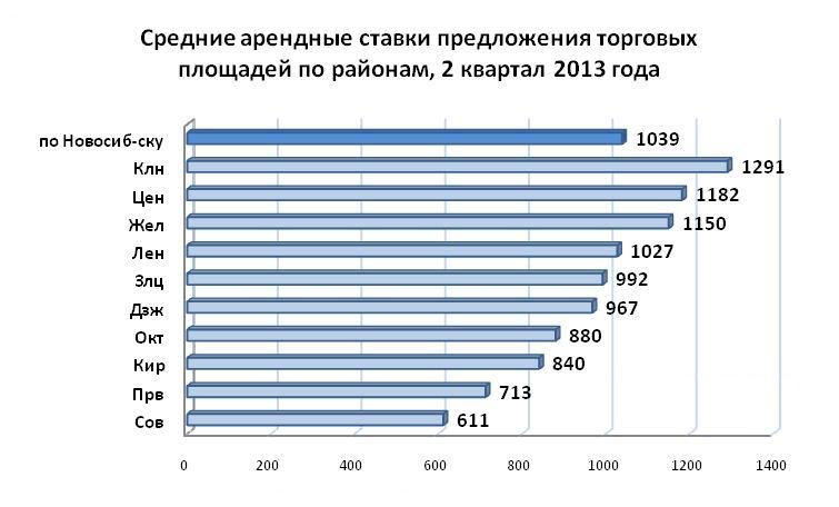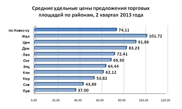 Самые высокие средние удельные цены продолжают оставаться в центральных районах. В Железнодорожном районе зафиксировано повышение средней удельной цены (+4% к уровню 1 квартала 2013 года). В Центральном районе удельная цена снизилась на 17,7% за счет появления на рынке, в достаточно большом количестве, новых недорогих торговых площадей, преимущественно в нежилых помещениях жилых домов.