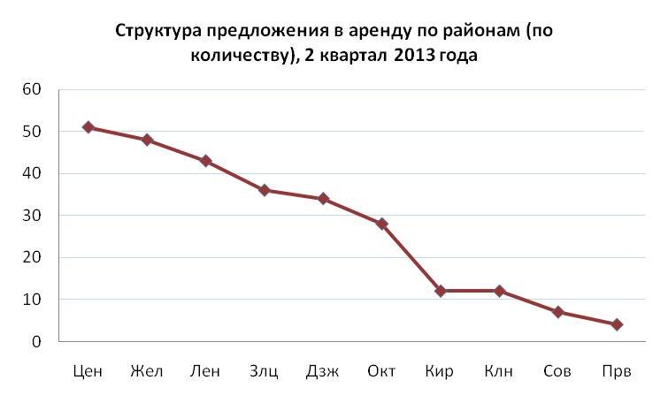 Общая площадь предложения торговых объектов в аренду во 2 квартале 2013 года составляла 107,6 тыс. кв.м. Это почти в 2 раза ниже, чем площадь, выставленная на продажу. По доле предложенных торговых площадей лидируют центральные районы, на которые приходятся 37% предложения. Далее объем предложения достаточно резко сокращается по мере удаления от центра города: на Кировский и Калининский районы приходится по 4 %, на Советский - 3 % и Первомайский район - 2 %.