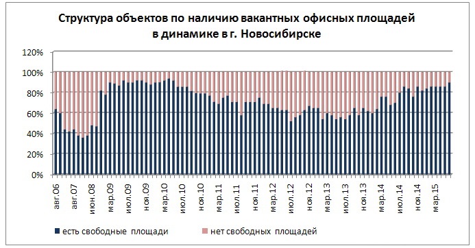 В июне 2015 г. максимальный уровень свободных помещений бизнес-центров наблюдался в группе объектов класса В – 11%.