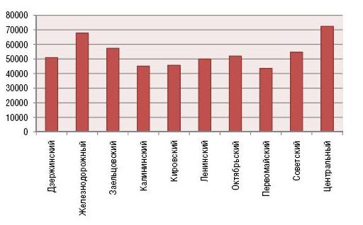 В Железнодорожном районе средняя стоимость 1 м2 составила 67700 руб. Третье место занял Заельцовский район со средней ценой 57400 руб. Минимальная средняя стоимость в III квартале 2010 года была в Первомайском районе- 43620 руб. за 1 м2.