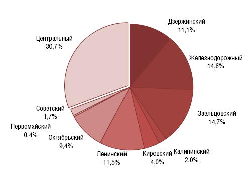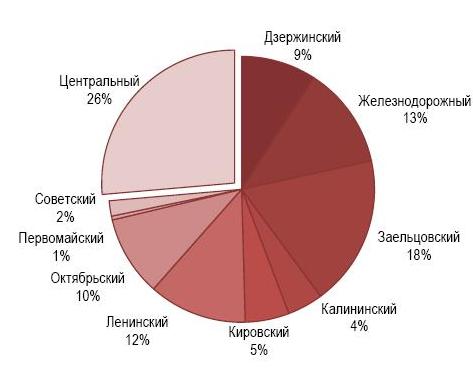 14,7% от общего предложения площадей расположено в Заельцовском районе, 14,6% - в Железнодорожном районе. В Ленинском районе предлагается для сдачи в аренду 11,5%, в Дзержинском-11,1%0т общего числа объектов соответственно. 9,%% пришлось на долю Октябрьского