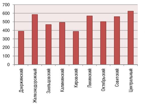 5. На рынке офисной недвижимости средняя ставка аренды 1 м2 была наибольшей в Центральном районе - 625 рублей, на втором месте - Железнодорожный район (584 рубля за 1 м2). Минимальная ставка аренды зафиксирована в Кировском районе (388 рублей за 1 м2).