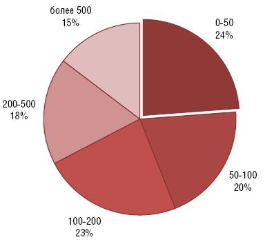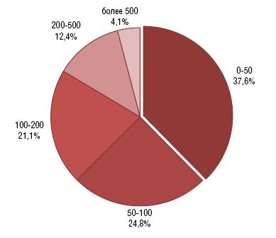 Помещения площадью от 50 до 100 м2 составляют 24,8%, от 100 до 200 м2 - 21,1%. Меньше всего в аренду предлагалось помещений площадью более 500 м2 - всего 4,1%.