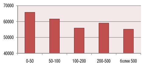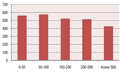 Самая высокая средняя ставка аренды в III квартале 2010 года была на офисные помещения площадью от 50 до 100м2 - 572 рубля. На втором месте по величине средней ставки аренды офисные помещения площадью менее 50 м2 - около 557 рублей. На 38 рублей меньше средняя арендная ставка на варианты площадью от 100 до 200 м2. Самая низкая средняя арендная ставка 1 м2 офисной недвижимости была на помещения площадью более 500 м2.