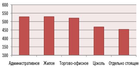 Самая высокая средняя арендная ставка соответствует офисным помещениям в жилых домах, она составила 530 рублей за 1 м2. Примерно такая же средняя ставка аренды в административных зданиях (528 рублей) и торгово-офисных зданиях (521рубль). Наименьшая средняя ставка аренды была на офисные объекты, предлагаемые в аренду целиком - 454 рубля за 1 м2.