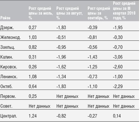 Согласно полученным цифрам, наибольшее снижение средней стоимости за III квартал 2010 года наблюдалось в Калининском районе и составило 3,06%.