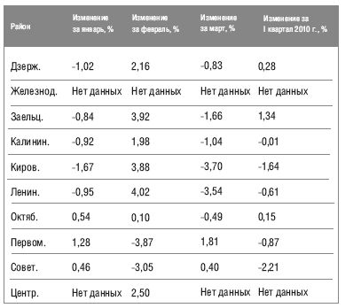 Согласно полученным цифрам, наибольшее снижение за I квартал 2010 года наблюдалось на коттеджи в Советском районе и составило 2,21%. На втором месте по падению средней стоимости - Кировский район, снижение средней стоимости коттеджей в нем составило 1,64%. В Заельцовском районе наблюдалось небольшое увеличение средней стоимости коттеджей на 1,34%. В остальных районах изменение средней стоимости было незначительным.