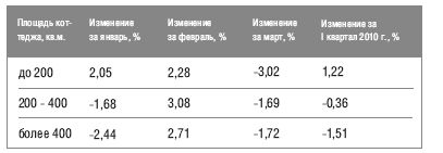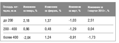 В I квартале 2010 года наибольшее снижение средней стоимости наблюдалось у коттеджей площадью более 400 кв.м., средняя цена на дома площадью от 200 до 400 кв.м. за последние 3 месяца практически не изменилась. Рост средней стоимости строений площадью менее 200 кв.м. - 1,22%.