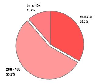 Более половины в предложении коттеджей НСО составили дома площадью от 200 до 400 кв.м., 33,5% - с площадью менее 200 кв.м. и 11,4% - с площадью более 400 кв.м.