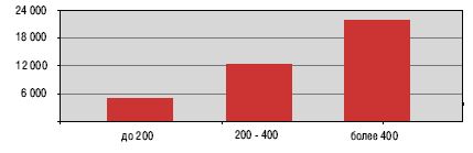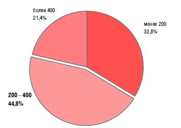 44,8% предложенных коттеджей были площадью от 200 до 400 кв.м., 33,8% домов имели общую площадь менее 200 кв.м., площадь 21,4%, выставленных на продажу коттеджей, превышала 400 кв.м.