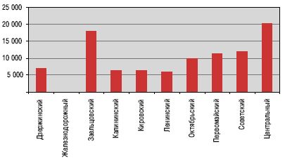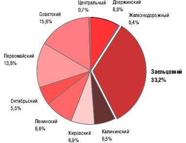 На втором месте по количеству коттеджей Советский район (15,6%). 13,8% от общего числа коттеджей располагались в Первомайском районе, 8,8% - в Дзержинском, 8,6% - в Ленинском, 6,9% - в Кировском районах. Меньше всего коттеджей предлагалось в Центральном и Железнодорожном районах - менее 1%.