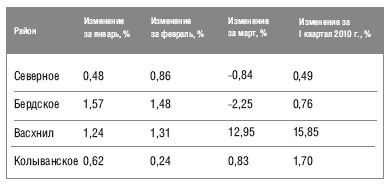 За I квартал 2010 года изменение средней стоимости коттеджей в г. Новосибирске было незначительным и составило 0,11%. Максимальное изменение средняя цена получила в феврале, в пределах 3%.