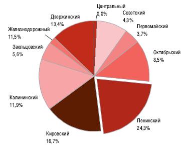 На втором месте Кировский район - 16,7%, немного отстает от него Дзержинский район -13,4%, Калининский район - 11,9% и Железнодорожный район - 11,5%. 8,5% от общего предложения складских площадей пришлось на долю Октябрьского района. В Центральном районе складских площадей на продажу не предлагалось.