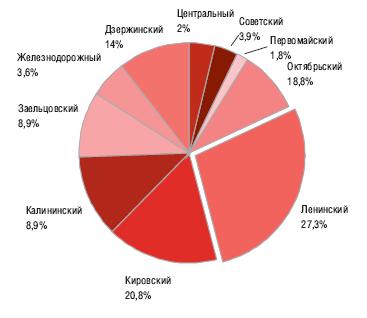 Наибольшее число помещений было предложено к сдаче в аренду в Ленинском, Кировском и Дзержинском районах. Наименьшим предложение было в Первомайском районе.