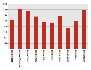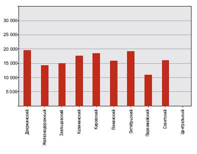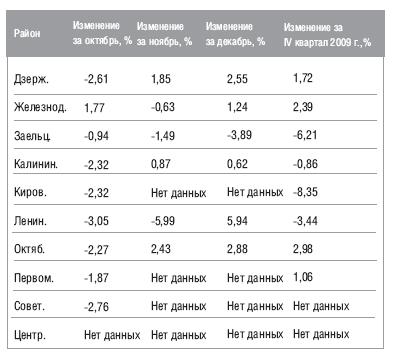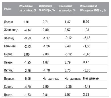 На 100 рублей от него отстал Октябрьский район, в нем средняя стоимость 1 кв.м. составила 19500 руб. На третьем месте расположился Кировский район со средней ценой 19160 руб. Минимальная средняя стоимость в IV квартале 2009 года была в Первомайском районе - около 11200 рублей за 1 кв.м.
