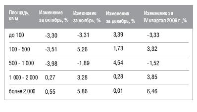 В IV квартале 2009 года наибольшее снижение средней стоим ости 1 кв. м наблюдалось у складских помещений площадью от 1000 до 2000 кв.м. - почти на 6%, максимальное увеличение - у помещений площадью от 100 до 500 кв.м. - на 7,29%.