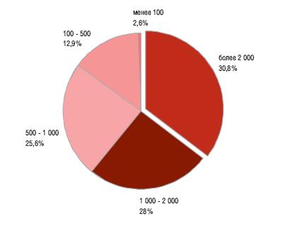 Помещения площадью от 500 до 1000 кв.м. составили 24%, от 1000 до 2000 кв.м. - 18,2%. Меньше всего в аренду предлагалось помещений площадью менее 100 кв.м. - 10%