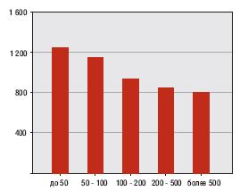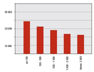 Самая высокая средняя ставка аренды в IV квартале 2009 года была на складские помещения площадью до 100 кв.м. - 200 рублей. Н а 15 рублей меньше средняя арендная ставка на варианты площадью от 100 до 500 кв.м. Самая низкая средняя арендная ставка 1 кв.м. складской недвижимости была на помещения площадью более 1000 кв.м (161 рубль).