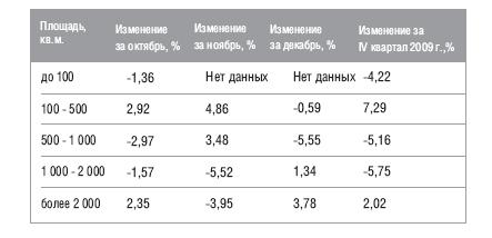 В IV квартале 2009 года наибольшее снижение средней стоимости 1 кв.м. наблюдалось у складских помещений площадью от 1000 до 2000 кв.м. - почти на 6%, максимальное увеличение - у помещений площадью от 100 до 500 кв.м. - на 7,29%.