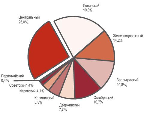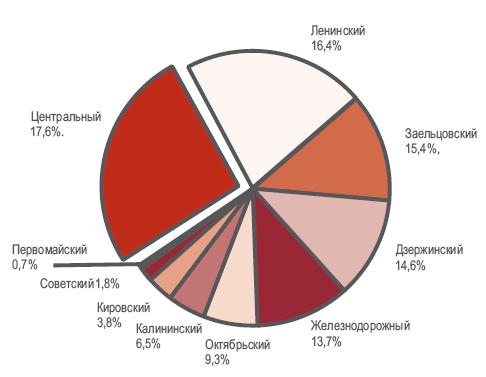 19,8% от общего предложения площадей расположено в Ленинском районе. В Железнодорожном районе предлагалось для сдачи в аренду 14,2% от общего числа объектов. На долю Заельцовского, Дзержинского и Октябрьского районов пришлось в среднем по 7-11%. Предложение в Советском и Первомайском районах не превышало 2%.