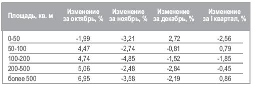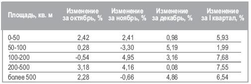 В I квартале 2011 года наибольшее снижение средней стоимости 1 кв. м наблюдалось у торговых помещений площадью менее 50 кв. м, оно составило 2,56%. В сегментах помещений площадью от 50 до 100 кв.м и более 500 кв. м наблюдалось небольшое увеличение средней стоимости - в пределах 1%.