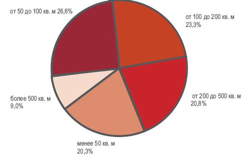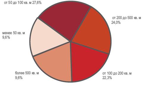 27,6% объектов торговой недвижимости, выставленных на продажу, имели площадь от 50 до 100 кв.м, помещения площадью от 200^до 500 кв.м составляли 24%, от 100 до 200 кв.м - 22,3%. Меньше всего в предложении было помещений площадью более 500 кв.м -9,6%.
