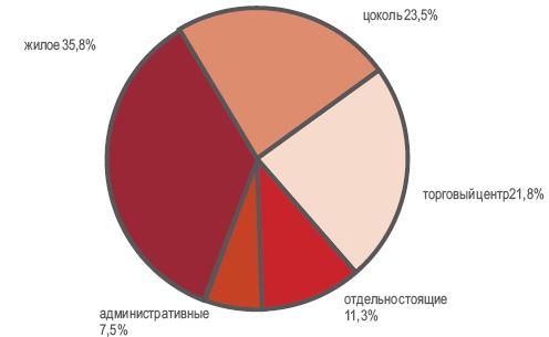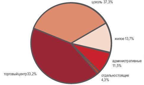 37,3 % помещений предлагалось в цокольных этажах, 33,2 располагалось в торговых центрах, 13,7 -в жилых домах, 11,5 -в административных зданиях. Всего 4,3 % от общего предложения пришлось на долю отдельно стоящих зданий, пригодных для торговли.
