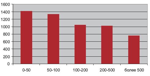 Самая высокая ставка аренды в I квартале 2011 года была на торговые помещения площадью до 50 кв. м - 1410 рублей. Немного меньше средняя арендная ставка на варианты площадью от 50 до