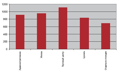 Наибольшая средняя арендная ставка соответствует торговым помещениям в торговых центрах, она превысила 1100 рублей за 1 кв. м. На втором месте по величине средней ставки аренды торговые площади в жилых домах - 954 рубля за 1 кв. м в месяц. Немного ниже ставки аренды на торговую недвижимость в административных зданиях. Самой низкой средняя ставка аренды в I квартале 2011 года была на торговые здания, сдаваемые в аренду целиком.