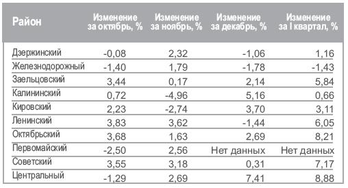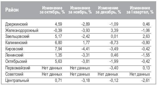Наибольшее снижение средней стоимости 1 кв. м за I квартал 2011 года наблюдалось в Центральном районе и составило 2,61%, в Ленинском районе снижение составило 1,55%, Железнодорожном -1,06%. Наибольшее увеличение средней стоимости торговой недвижимости было в Заельцовском районе - 2,63%.