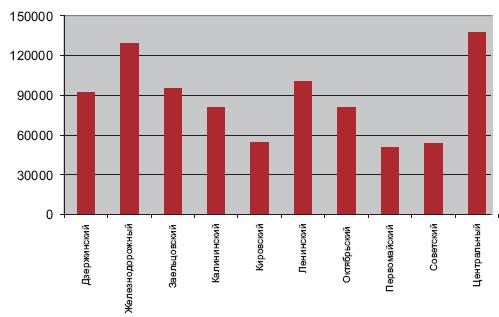 Наибольшая средняя стоимость 1 кв. м торговых площадей в I квартале 2011 года была в Центральном районе - 137400 руб. Примерно на 8200 рублей от него отстал Железнодорожный район, в нем средняя стоимость 1 кв. м составила 129200 руб. На третьем месте расположился Ленинский район со средней ценой 100160 руб. Наименьшая средняя стоимость в I квартале 2011 года была в Первомайском районе - 50700 рублей за 1 кв. м.